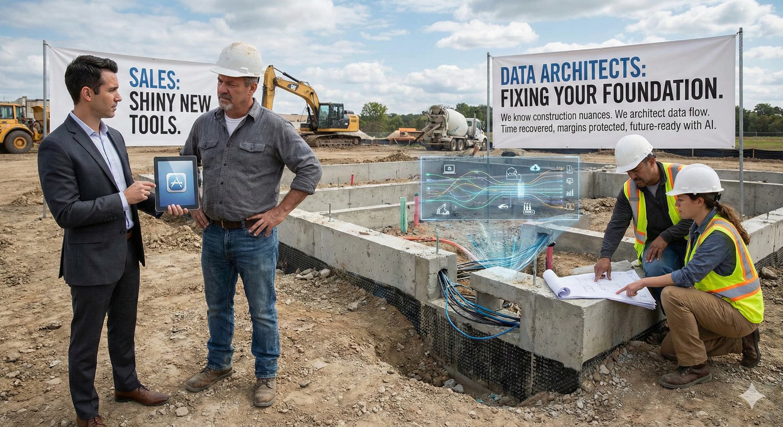 "A software salesman wants to sell you a shiny new tool. We want to fix your Data foundation. > Because we know the construction industry—the "nuances" of change orders, subcontractor holds, and progress billing—we don't just 'install' software. We architect a system where your data flows as smoothly as your best-run project. We give you back your time, protect your margins, and prepare your company for the future and AI is one of the tools we use."